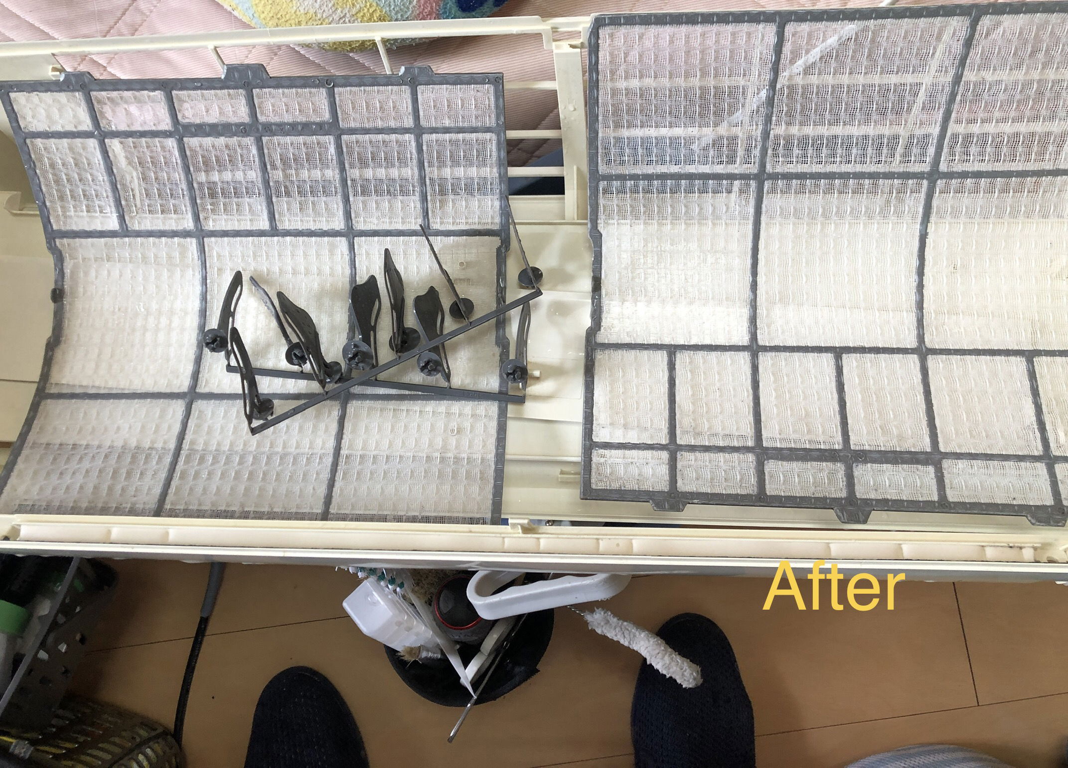 分解後、外装カバーやフィルターの清掃を行い、内部の熱交換器や送風ファンを含め、洗浄機を使用してきれいにクリーニングします。カビやホコリなどの汚れを落とし、清潔な風を取り戻し、エアコンの性能を向上させる作業です。